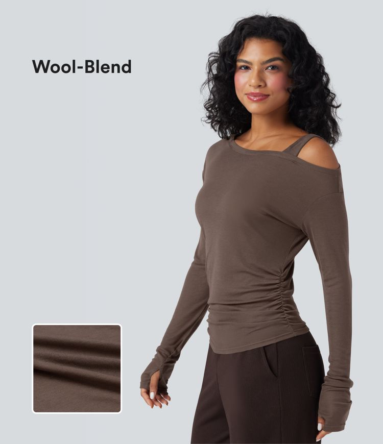 T-shirt décontracté asymétrique en mélange de laine à une épaule et manches longues