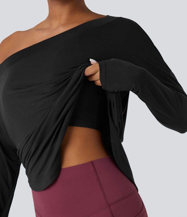 Top de sport yoga une épaule séchage rapide ourlet arrondi asymétrique manches longues avec trous pouces - Brassière intégrée