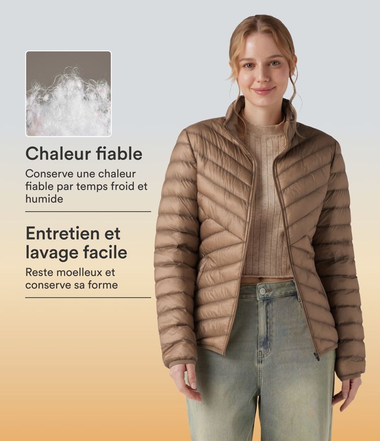 Packable casual zip-up jacket with synthetic down, stand-up collar, long sleeves, and pockets