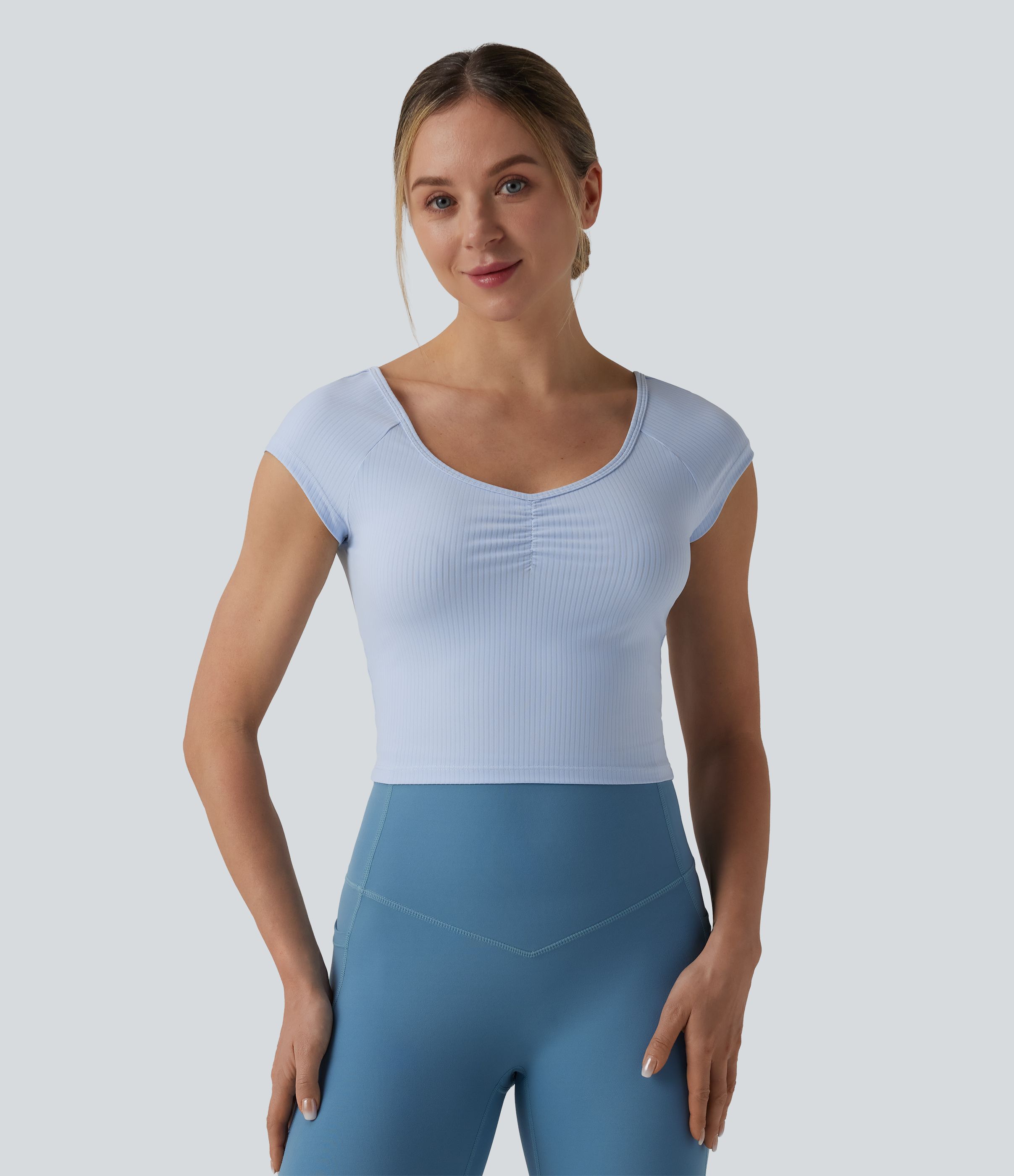 Haut de sport d'entraînement côtelé décolleté cœur manches courtes