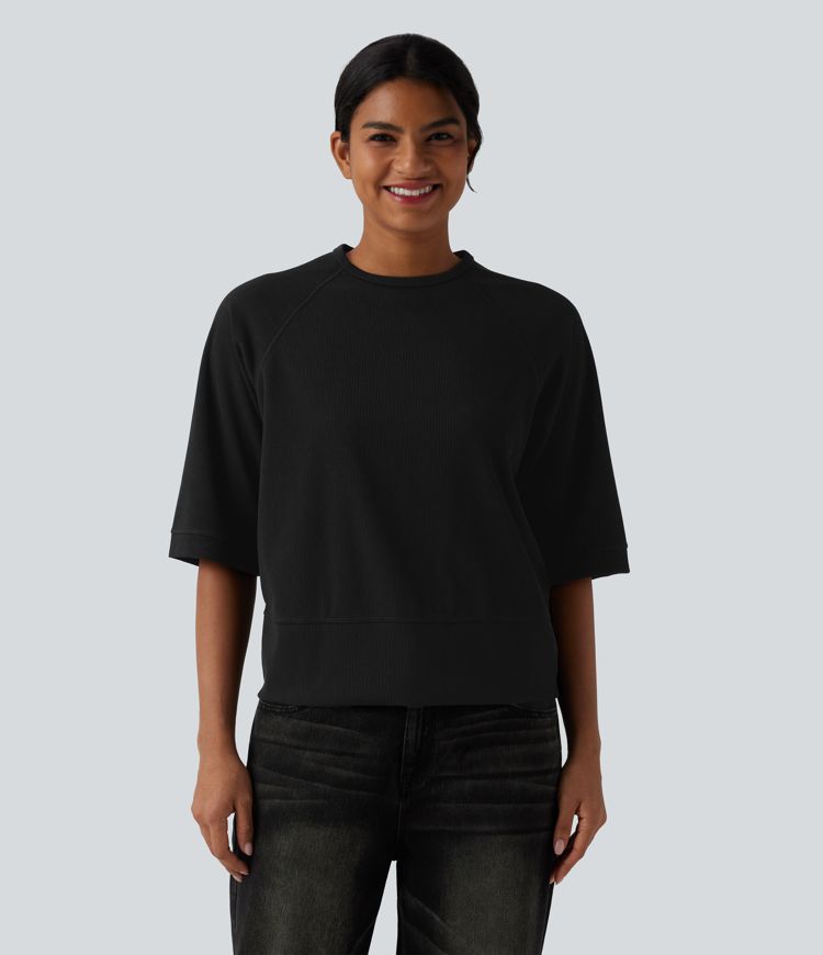 Sweatshirt décontracté côtelé col rond manches 3/4