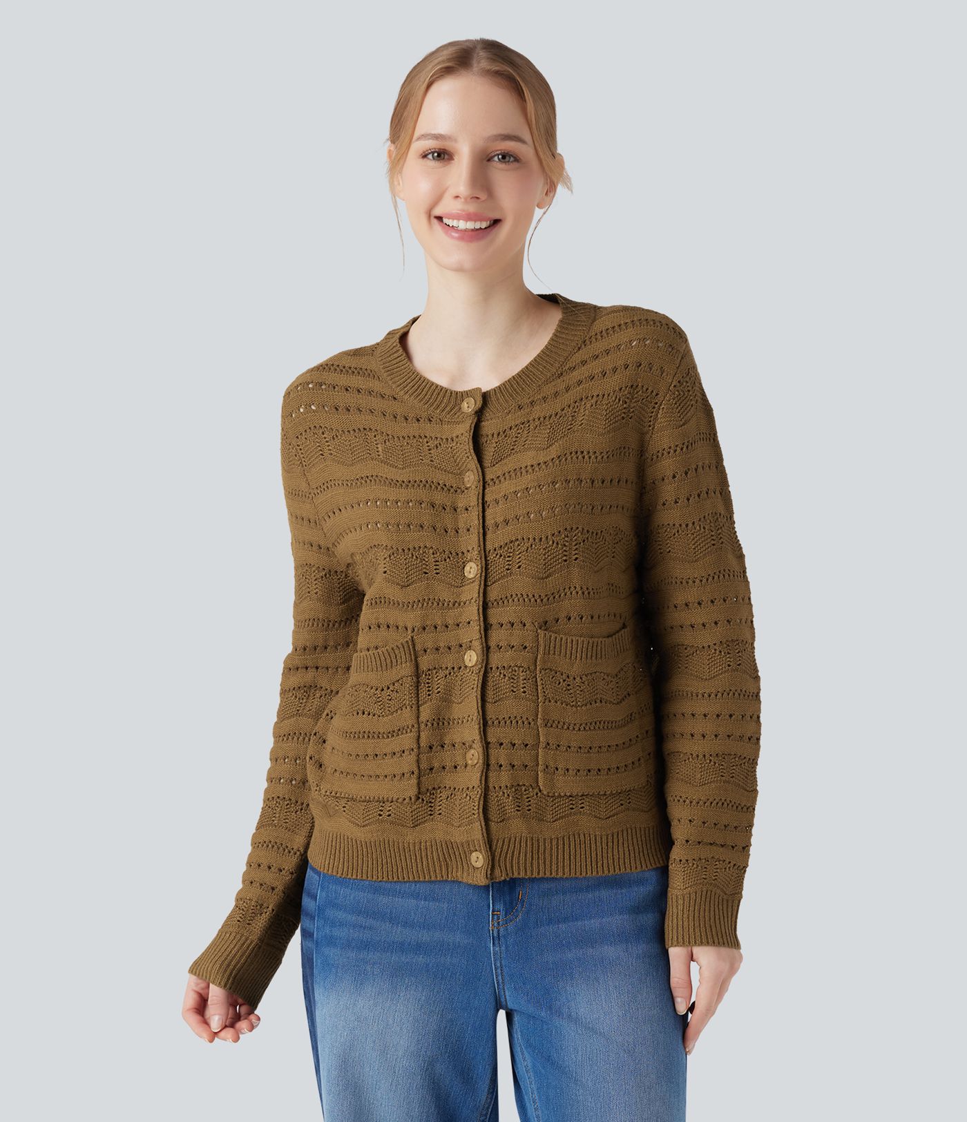 Cardigan de travail col rond à manches longues avec boutonnage et découpes avec poches
