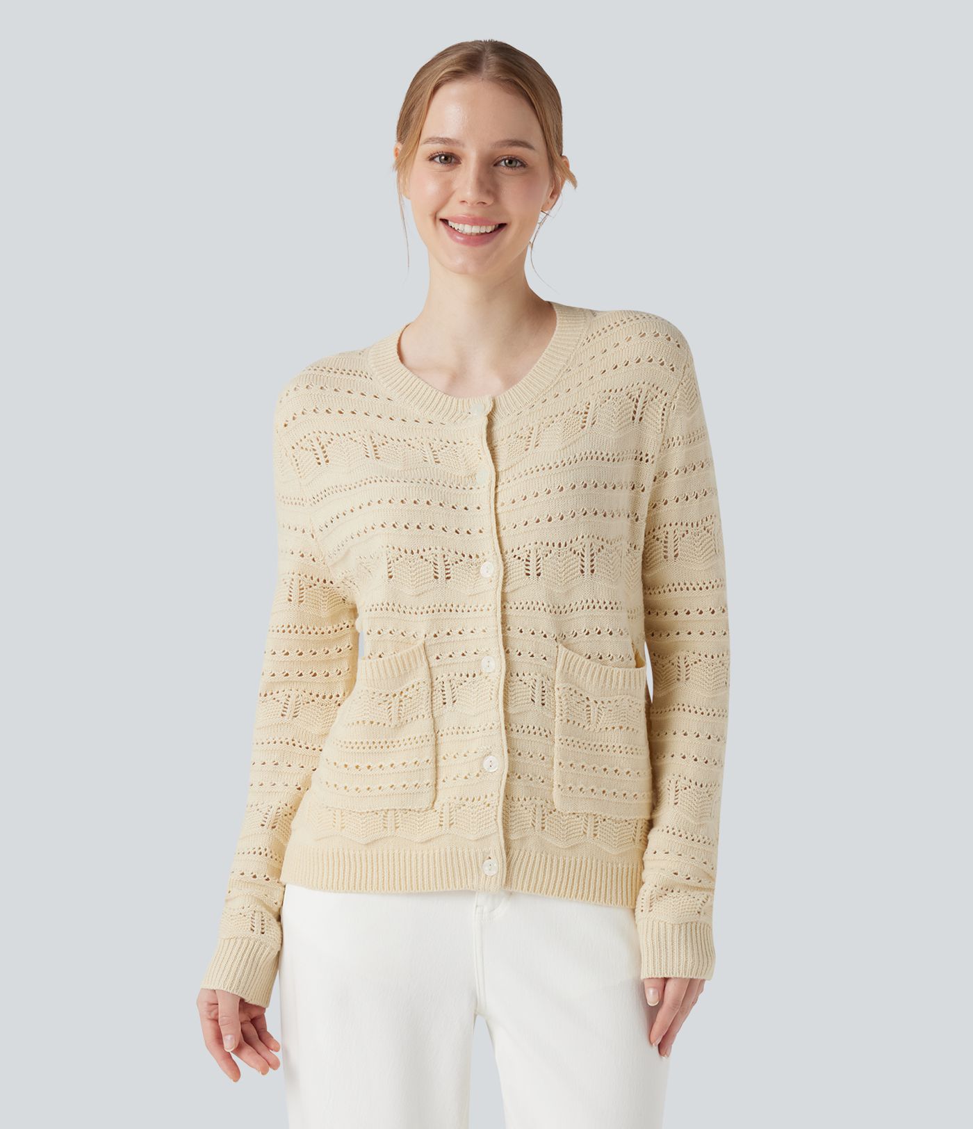 Cardigan de travail col rond à manches longues avec boutonnage et découpes avec poches