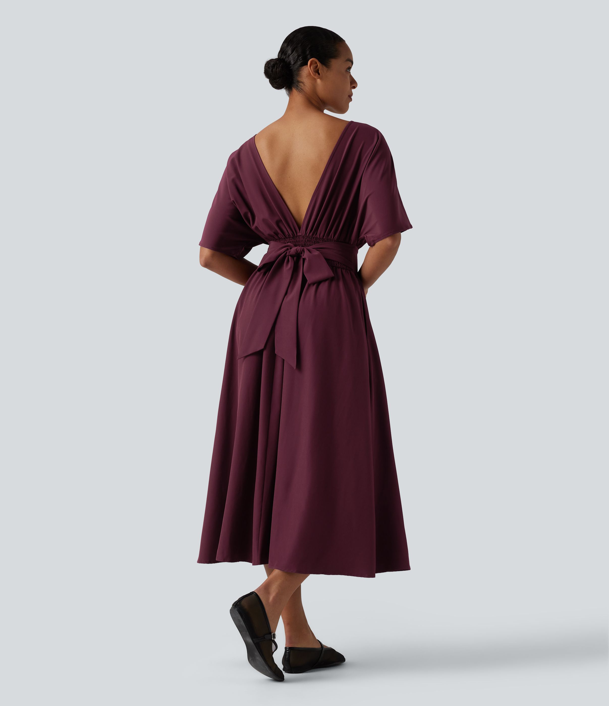 Robe midi décontractée col rond manches courtes avec nœud au dos et poches