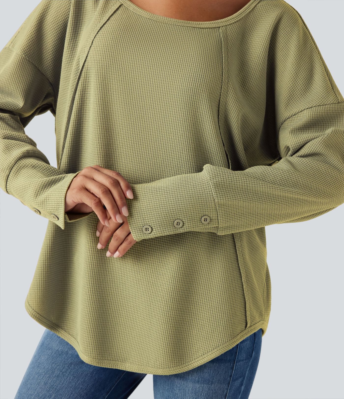 Top gaufré décontracté col échancré manches longues ourlet arrondi coupe décontractée