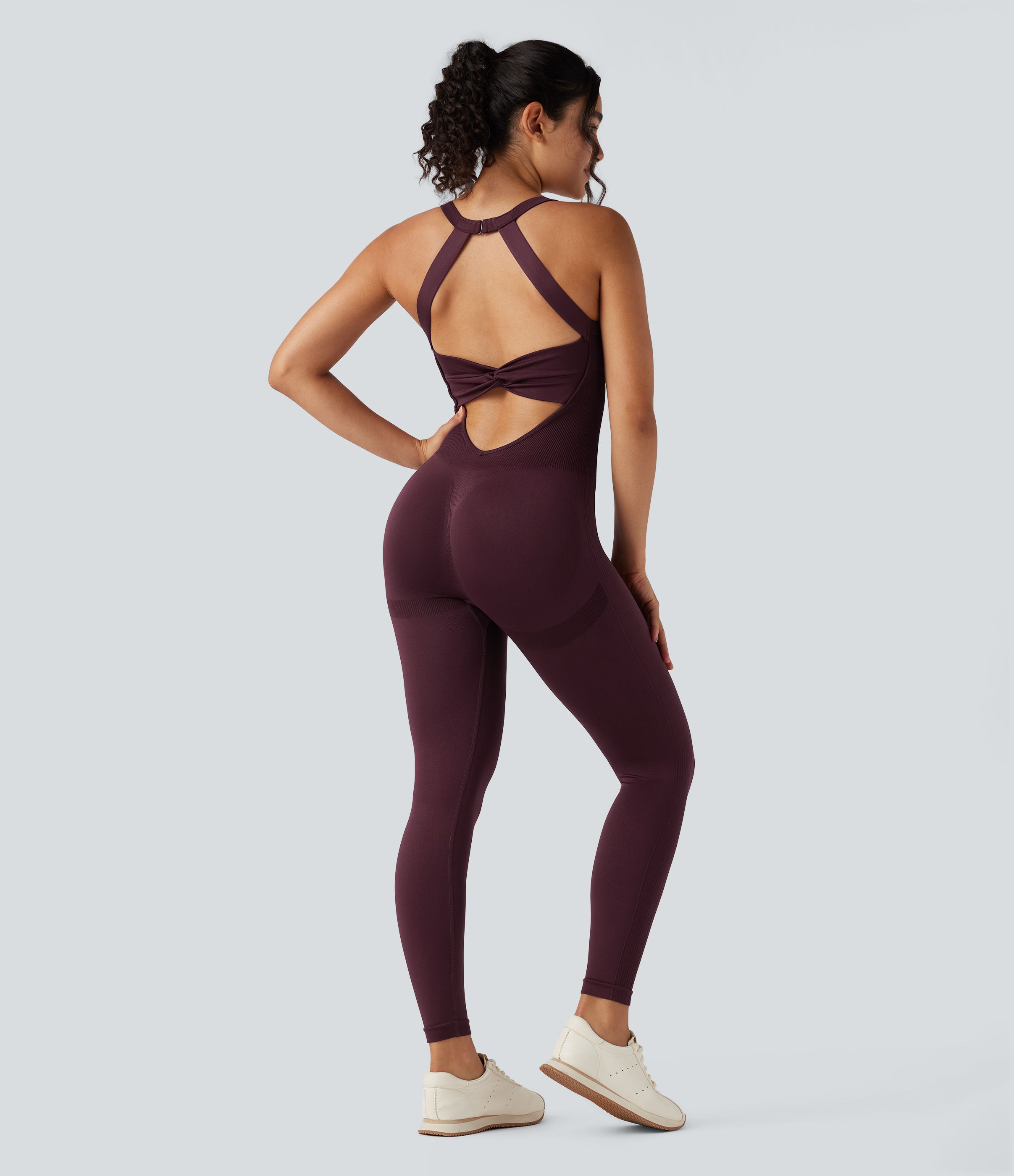 Combinaison d'entraînement ajustée dos nu torsadé sans manches sans couture Seamless Flow