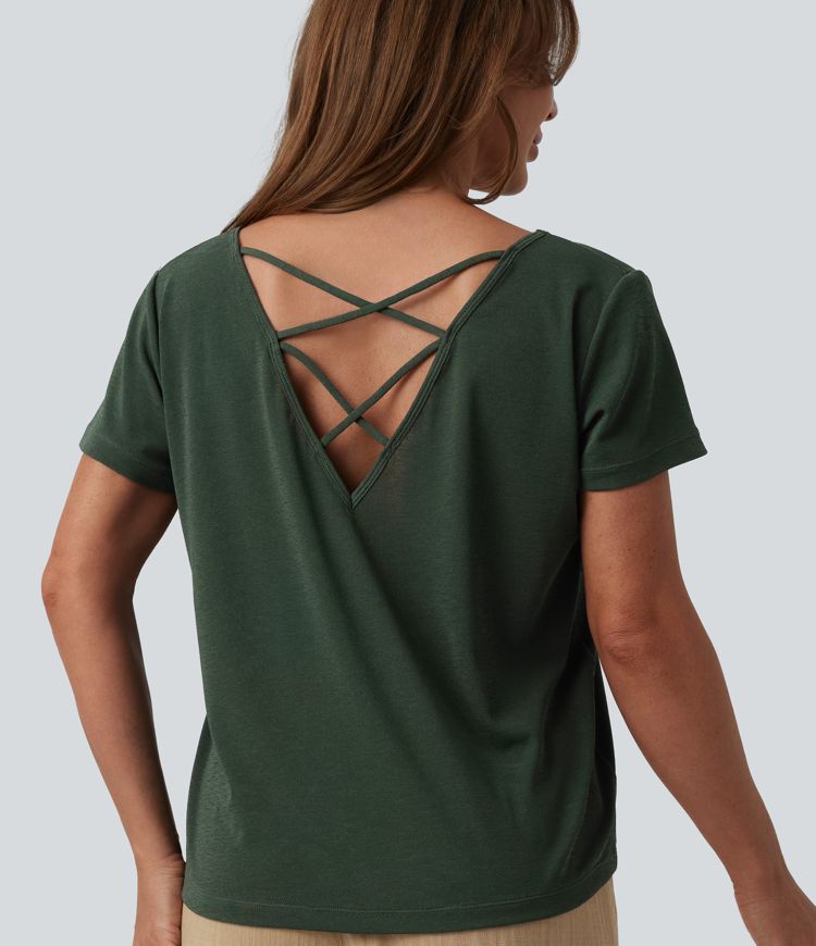 T-shirt casual col V manches chauve-souris dos nu à bretelles croisées