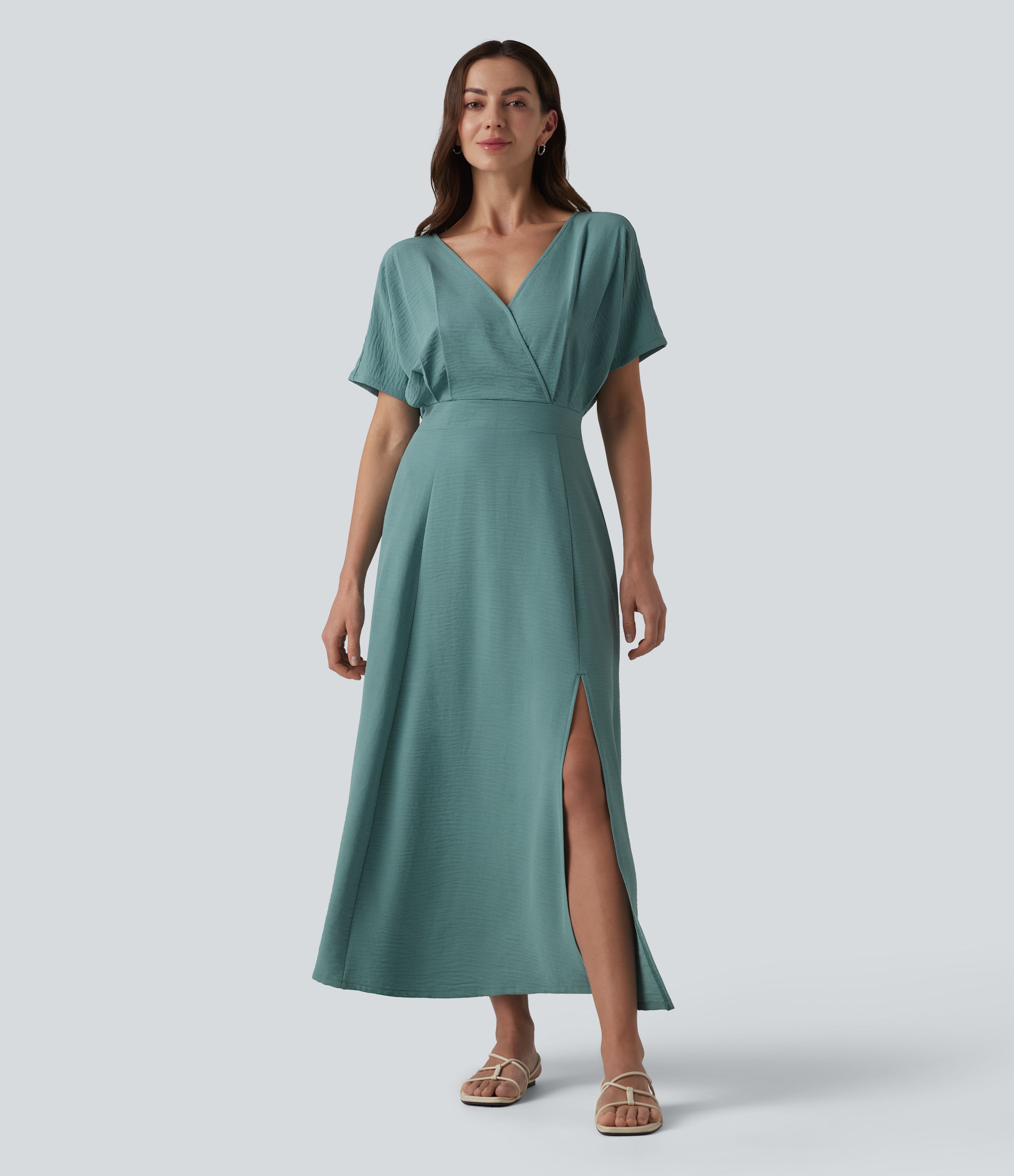 Robe midi col V manches courtes aspect lin avec poches